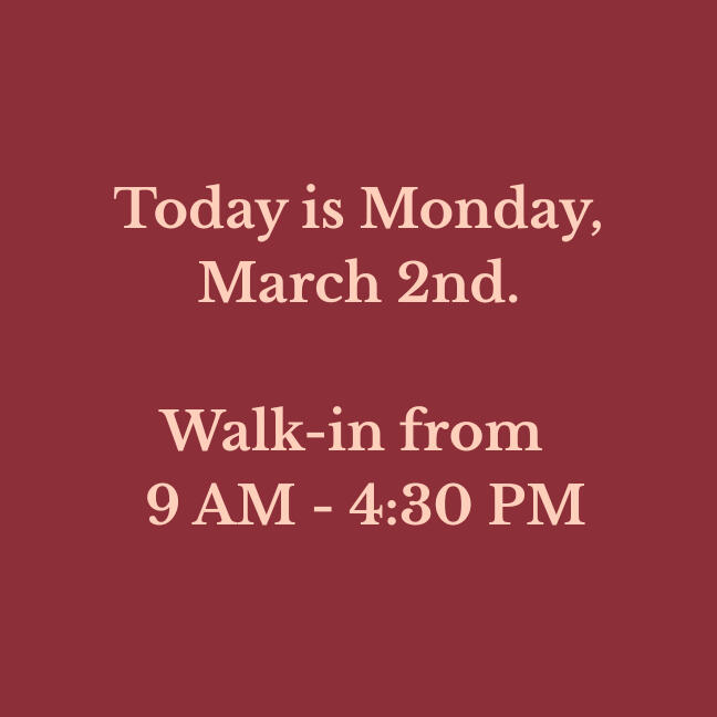 Walk-in hours are updated daily. Check to verify before you drive!