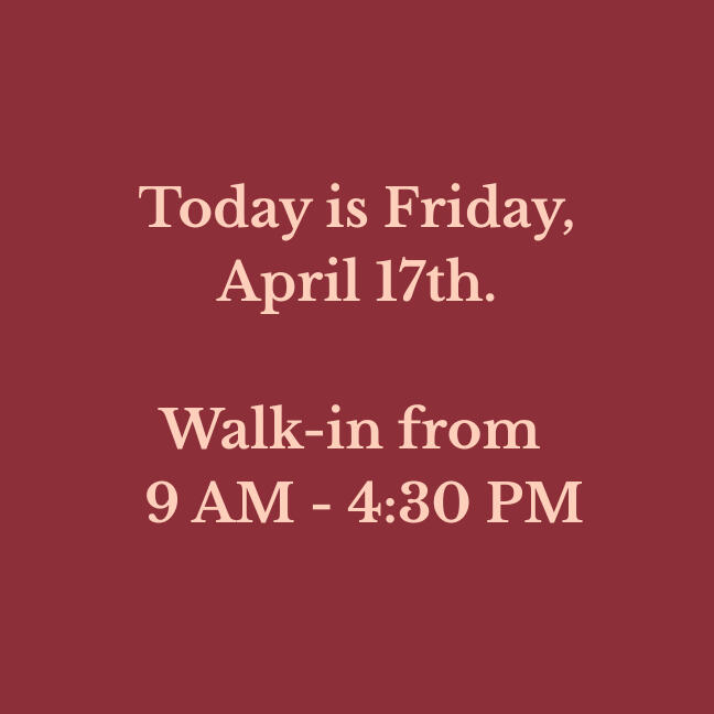 Walk-in hours are updated daily. Check to verify before you drive!